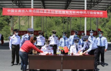 5月15日15时,云南出入境边防检查总站援助缅甸克钦邦移民厅、甘拜地移民局防疫物资援助移交仪式在腾冲边检站猴桥口岸中缅友谊隧道口举行。